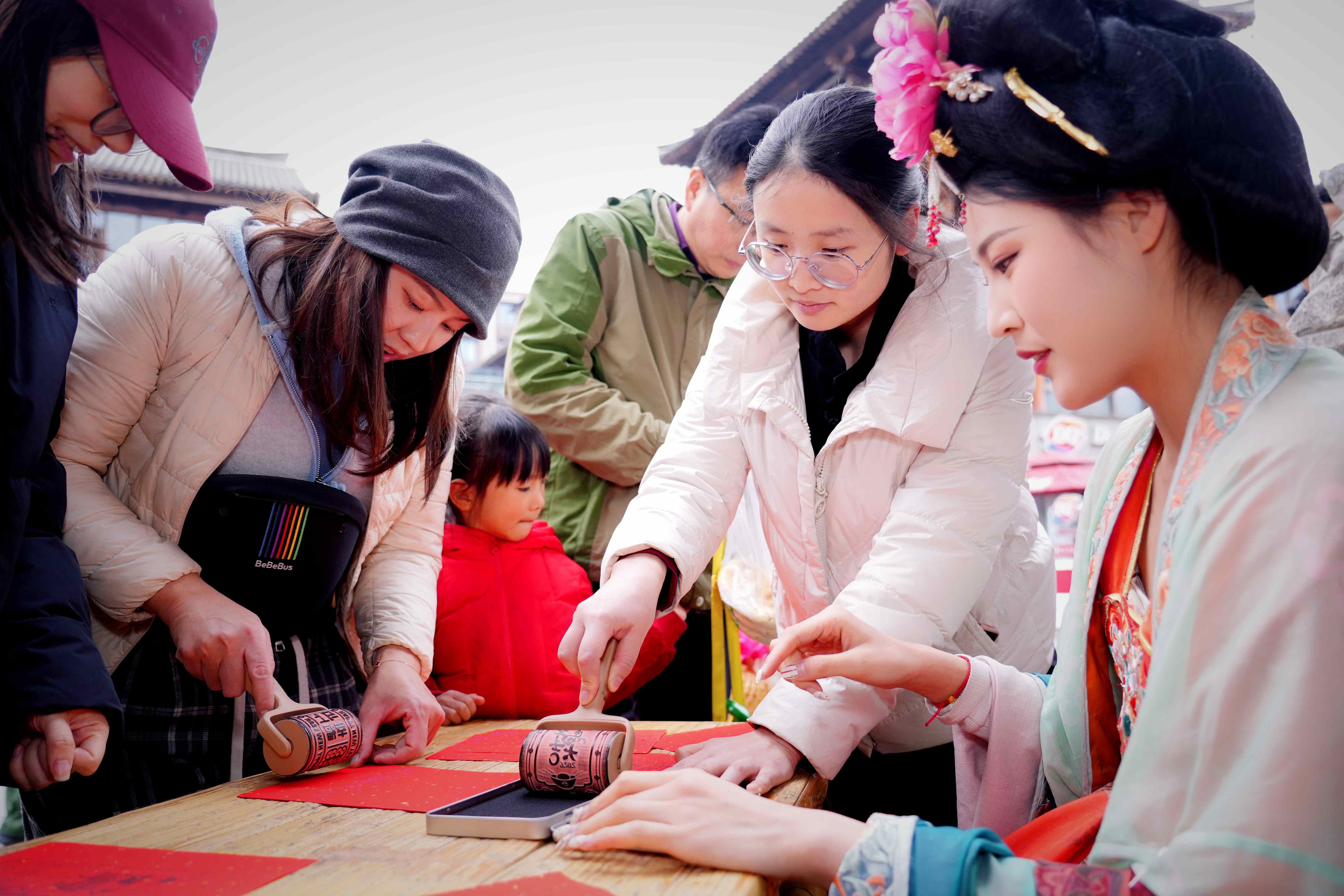 活动首日便突破单一展演模式,以汉服为纽带构建“穿、购、娱、食”全链条消费生态。现场设置的拓印制作教学,不少游客参与其中,感受传统技艺的温度;街区内汉服妆造馆、新中式茶饮店、文创商铺等商家同步联动,推出特色主题服务——妆造馆打造专属节日造型,茶饮店限定国风套餐,文创店上新汉服周边好物,全方位满足游客“穿、娱、食、购”多元需求;同时推出的“汉服+”消费激励措施备受关注,游客在活动期间可享街区内多家餐饮、零售商家折扣,进一步带动商户客流与营收增长,激活古街消费活力。